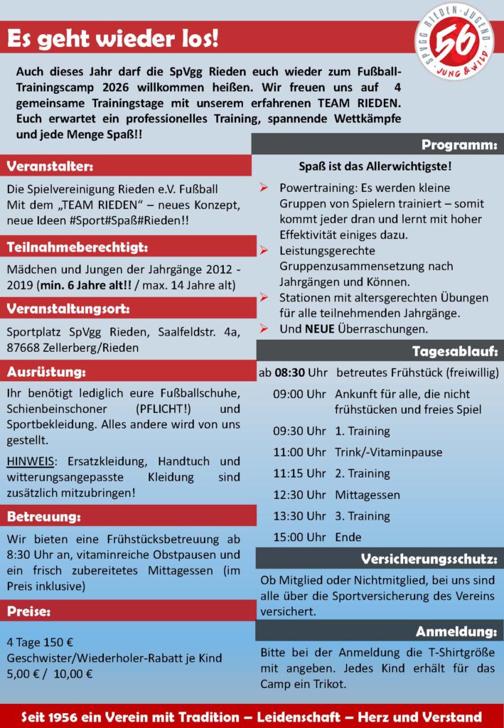 « Alle VeranstaltungenTrainings Camp´26August 3 - August 6« Altpapiersammlung der SpVgg RiedenBitte aktiviere JavaScript in deinem Browser, um dieses Formular fertigzustellen.Name Erziehungsberechtigter *VornameNachnameE-Mail-Adresse *Telefonnummer (Notfallkontakt während des Camps) / Bitte nach Möglichkeit Handynummer angeben *Aufnahme WhatsApp Gruppe für Informationen rund um das Camp und während des Camps? *JaNeinName des Kindes *VornameNachnameAnzahl der Camptage *4 - Tagescamp (Montag - Donnerstag)Jahrgang des Kindes *T-Shirt Größe *In welchem Verein spielst du? *Kommst Du zum Frühstück *JaNeinLiegen Allergien vor, die wir wissen sollten? *Anliegen oder Fragen?Datenschutzerklärung *Ich willige ein, dass die SpVgg Rieden e.V., als verantwortliche Stelle, die in der Anmeldung erhobenen personenbezogenen Daten, wie Namen, Vorname, Geburtsdatum, E-Mail-Adresse, Telefonnummer ausschließlich zum Zwecke der Organisation des Jugendcamps und der Übermittlung von Vereinsinformationen durch den Verein verarbeitet und genutzt werden. Neben dem Recht auf Auskunft bezüglich der zu seiner Person bei dem Verantwortlichen des Verein gespeicherten Daten hat jeder Teilnehmer, im Rahmen der Vorgaben der DSGVO, das Recht, der Speicherung der Daten, die nicht im Rahmen der gesetzlichen Vorgaben für bestimmte Zeiträume vorgehalten werden müssen, für die Zukunft zu widersprechen. Ferner hat jeder Teilnehmer, im Falle von fehlerhaften Daten, ein Korrekturrecht. Ich willige ein, dass die SpVgg Rieden e.V. meine E-Mail-Adresse und, soweit erhoben, auch meine Telefonnummer zum Zwecke der Kommunikation nutzt. Eine Übermittlung von E-Mail-Adresse und Telefonnummer, wird weder an den BLSV oder die Fachverbände noch an Dritte vorgenommen. Ich willige ein, dass die SpVgg Rieden e.V. Bilder/Videos von dem Jugendcamp auf der WebSite des Vereines oder sonstigen Vereinspublikationen veröffentlicht und an die Presse zum Zwecke der Veröffentlichung ohne spezielle Einwilligung weitergibt. Die/der Teilnehmer(in) erklärt sich außerdem mit der Veröffentlichung seines Namens und Vornamens, seiner Altersklasse, seines Vereins und seiner Ergebnisse (Platzierungen) in allen veranstaltungsrelevanten Printmedien (Teilnehmerliste, Ergebnisliste, etc.) und in allen elektronischen Medien, wie dem Internet, einverstanden.MessageSenden Zum Kalender hinzufügen Google Kalender iCalendar Outlook 365 Outlook Live Details Beginn: August 3 Ende: August 6 Webseite: www.spvggrieden.deVeranstalter SpVgg Rieden e.V. Veranstaltungsort Sportgelände der SpVgg Rieden e.V. Saalfeldstraße 4a Rieden/Zellerberg, 87668 Deutschland Google Karte anzeigen